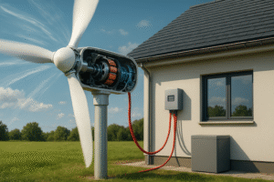 مبدل و شبکه یا باتری: در بسیاری از مسکنها، ژنراتور خروجی جریان مستقیم (DC) تولید میکند که باید توسط اینورتر به جریان متناوب (AC) تبدیل شود تا با سیستم برق خانگی یا شبکه سازگار شود. در سیستمهایی که ذخیره باتری وجود دارد، برق تولیدی ابتدا به باتری میرود.