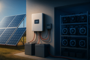 اینورتر برق DC پنلها را به AC تبدیل میکند تا ماینرها بتوانند از برق خورشیدی استفاده کنند. اینورترهای هیبرید و شبکه متصل بهترین انتخاب برای مدیریت باتری و مصرف مستقیم ماینرها هستند.